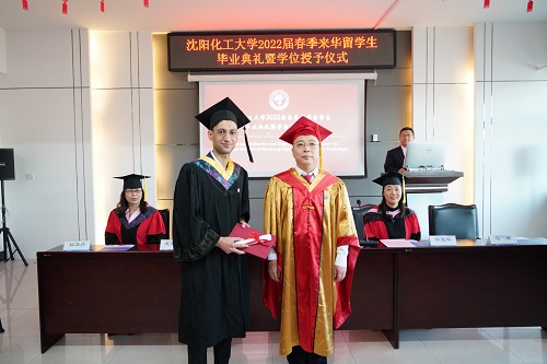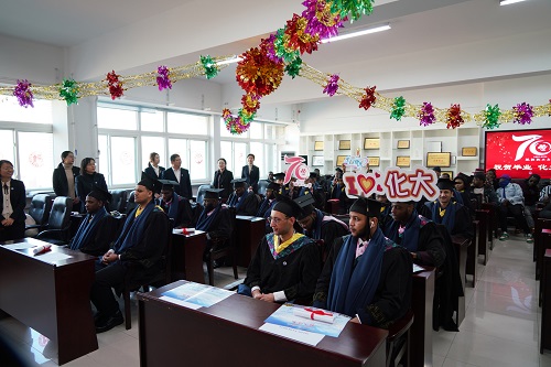 国际教育学院辅导员张舒怡作为教师代表发言。她希望毕业生带着母校的祝福,为推动构建人类命运共同体作出自己的贡献。来自巴基斯坦的留学生丁凯作为优秀毕业生代表发言。他分享了在化大学习生活的经历,同时表达了对学校及老师的感谢。他表示,作为化大人,要为更美好的明天努力奋斗。