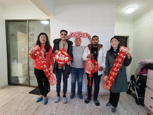 走访的第二站是也门籍杜仁德、巴基斯坦籍白嘉和尼泊尔籍马俊德3名男生的家,让人意外的是小伙子们把家中打扫得干净整洁,为欢迎老师们的到来还特意准备了甜点,点点滴滴的细节透露出留学生的真挚情感和用心。老师们与留学生一起剪纸,制作福字、窗花等作品,增进留学生对中国传统文化的了解和认同。