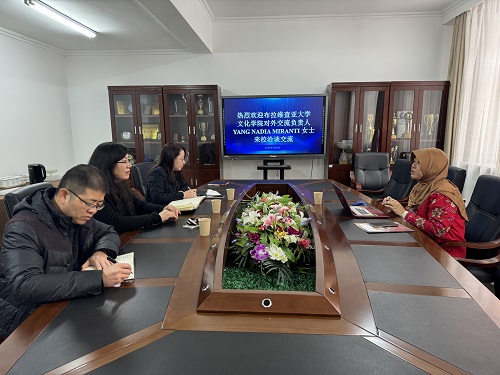 1月2日上午,印度尼西亚布拉维查亚大学文化学院对外交流负责人YANG NADIA MIRANT女士到贝博官网国际教育学院交流访问。国际教育学院直属党支部书记、院长王春雨,副院长王亮,副院长杨博,行政干事杨若冰参加会见。会议由王春雨主持。