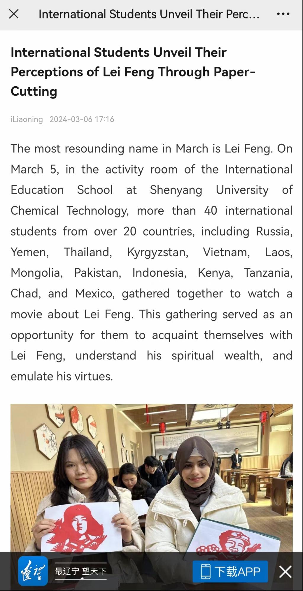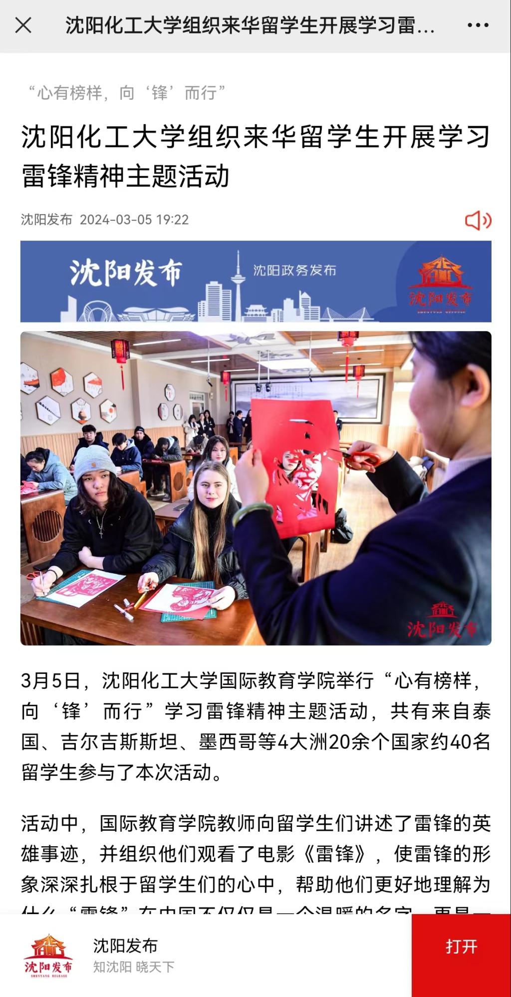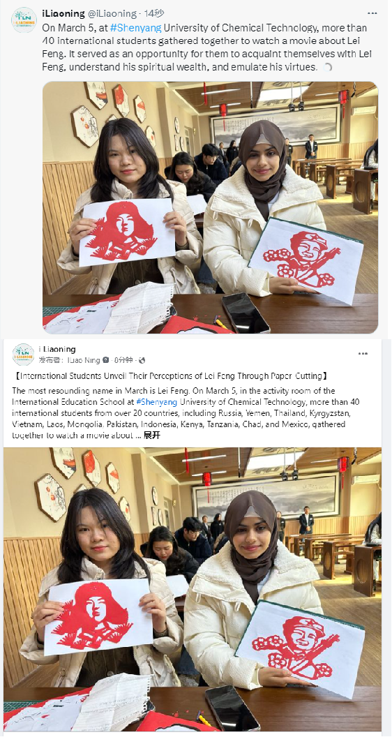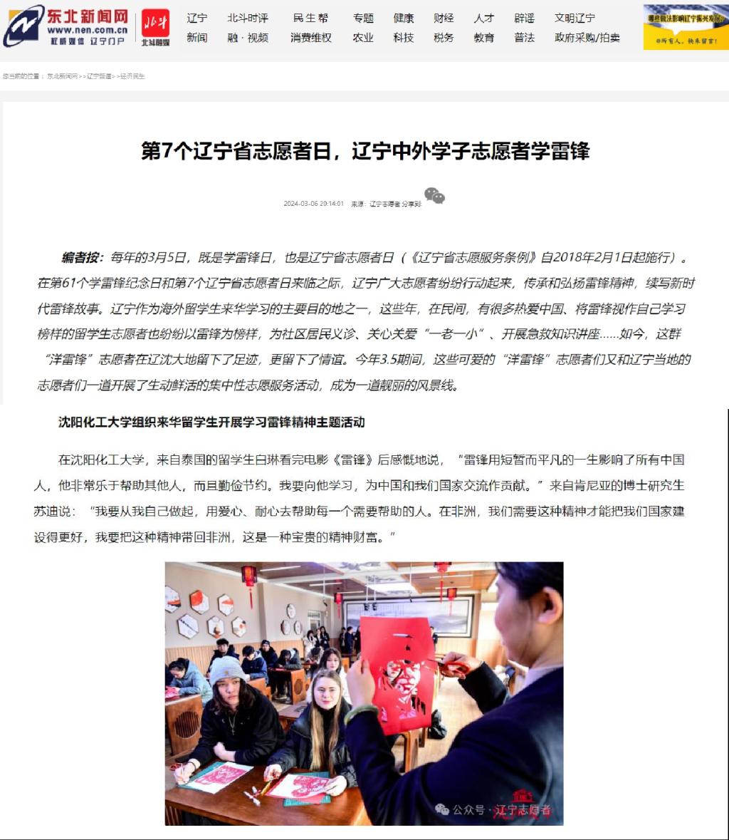 3月5日,在全国第61个学雷锋纪念日到来之际,贝博官网国际教育学院组织来华留学生开展“心有榜样,向‘锋’而行”学习雷锋精神主题活动,共有来自俄罗斯、也门、泰国、吉尔吉斯斯坦、越南、老挝、蒙古、巴基斯坦、印尼、肯尼亚、坦桑尼亚、乍得、墨西哥等4大洲20余个国家约40名留学生参与其中。本次活动获得了东北新闻网、辽望客户端、沈阳日报、“沈阳发布”客户端、沈阳发布英文公众号、《中国日报》“留学中国”海外社交媒体平台、辽宁国际传播中心海外平台Facebook以及Twitter等多家省市级媒体的报道和转载。