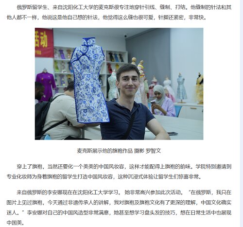 俄罗斯籍留学生麦克斯展示旗袍作品、李安娜接受中央广电总台国际在线记者参访。