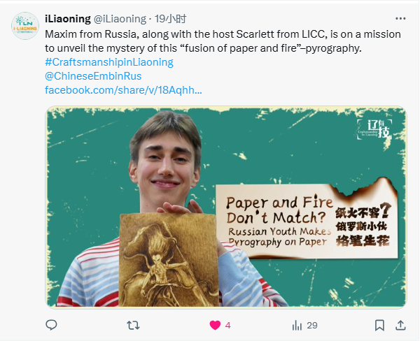 辽望客户端以《Paper and Fire Don’t Match? Russian Youth Makes Pyrography on Paper》(纸火不容?俄罗斯小伙烙笔生花)为题,对本次活动进行了报道,并同步发布于Facebook、Twitter等海外社交媒体平台,向世界展示中华优秀传统文化的独特魅力。