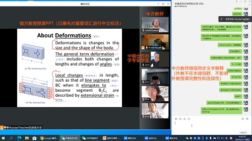 根据疫情期间“停课不停教,停课不停学”、“保证在线学习与线下课堂教学质量实质等效”的总体要求,机械与动力工程学院根据学校部署,引导教师积极采用多种现代信息手段保障在线授课质量。《材料力学》是机械与动力工程学院中俄合作办学能源与动力工程专业的核心课程,其授课采用了俄罗斯伊尔库茨克国家研究型技术大学PERELYGINA Aleksandra副教授和贝博官网苏勇副教授联合“同步课堂”教学模式,教学效果良好。