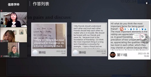 课堂上崔晗老师娴熟运用瞩目的分组讨论功能,雨课堂的投票、弹幕和小组任务等功能,采用“任务式”教学法和“小组合作”学习模式,培养学生自主探究能力、协作学习能力,激发了学生参与口语任务的热情和兴趣。课程最后,崔晗老师用社会主义核心价值观的英文表达做总结和拓展,引导学生对于真善美的追求和认同。同学们的口语表达内容中也都传达出了满满的正能量。