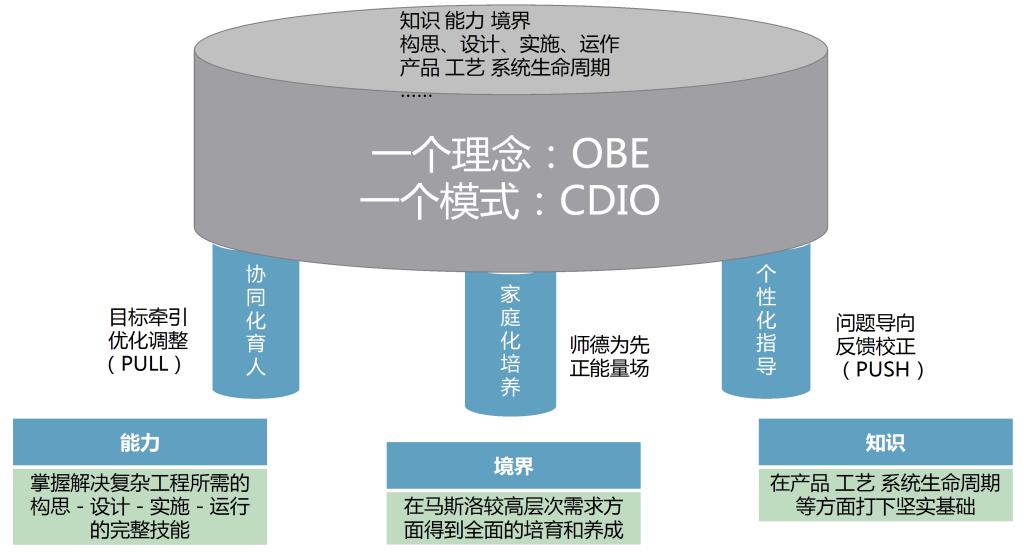 “CDIO”教育模式是“113”的第二个“1”,是“一种模式”,引进先进的工程教育模式,即“CDIO”模式[5]。从2000年起,麻省理工学院和瑞典皇家工学院等四所大学组成的跨国研究,创立了CDIO工程教育模式,并成立了以CDIO命名的国际合作组织[6]。它是由“MIT”等国际著名大学联合开发的一种先进的人才培养模式,为学生提供一种强调工程基础的、建立在真实产品和系统的构思-设计-实现-运行(CDIO)过程的背景环境基础上的工程教育[7]。这种培养模式是针对一个产品和系统的生命周期设计的,但它可以推广到其它行业。实际上是构建了一种按照职场环境培养人的科学的人才培养模式。如果说“OBE”告诉了做什么的话,“CDIO”告诉了怎么做,它规定了一整套课程开发、课程教学和课程评价测量,来保证在教学设计、实施和评价中正确体现“OBE”理念。从教育模式上保证了供给侧和需求侧相符合。