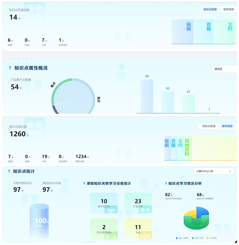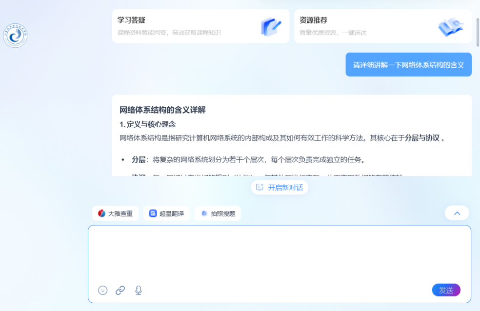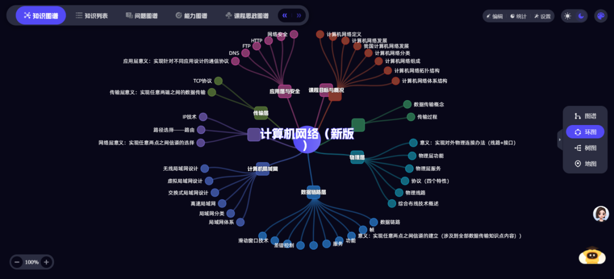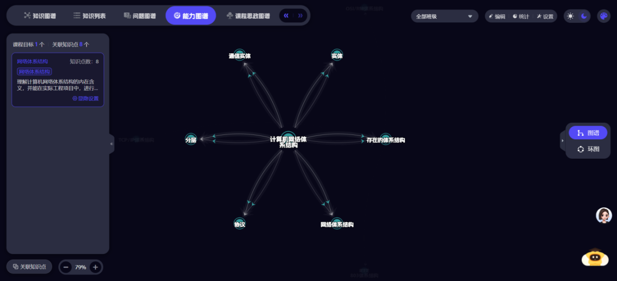 课程团队基于超星泛雅平台,集成DeepSeek-化大小计等大模型能力,打造计算机网络智慧课程平台,建立97个知识点、14个知识点资源、1260个教学资源、54个拓展资源,形成知识图谱、能力图谱、课程思政图谱等相关数字资源,为智慧课程建设打下良好的基础。学生可通过自然语言提问,AI助手即时生成可视化解析学生学习的效率得到大幅度提升