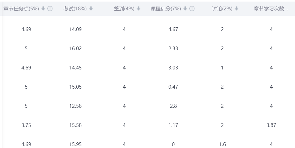 章节学习过程(4分):在课程在线资源中,每个章节有相应内容讲解视频或PPT,学生利用课下时间自主完成,考查学生主动学习的情况由平台自动分析并获得相应分数。