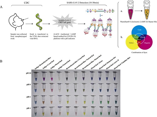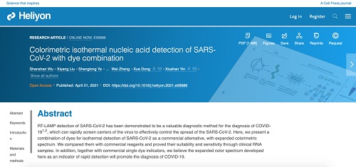 在上述工作的基础上,尹秀山团队开发出了一种基于组合变色方式,可用于SARS-CoV-2恒温检测的新型染料组合。该新型比色组合利用双染料的复合色方法,不仅可以用于新冠病毒的检测,还可以延伸到其它病原体恒温检测,且灵敏度和准确性较高,有助于新冠病毒大流行期间对COVID-19的快速检测。该工作已经申请国家发明专利。
