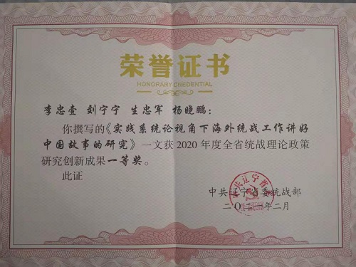 李忠壹同志主持的“辽宁省统战理论研究2020年重点课题”成果《实践系统论视角下海外统战工作讲好中国故事的研究》一文,获2020年度全省统战理论政策研究创新成果一等奖。