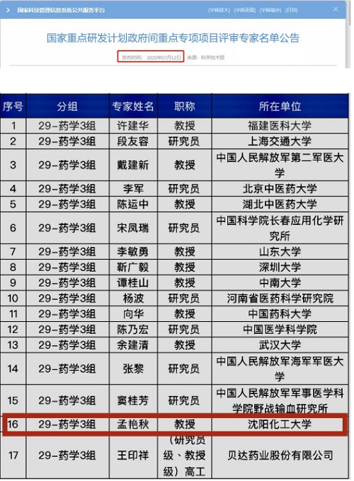 7月12日,国家科技管理信息系统公共服务平台发布了《国家重点研发计划政府间重点专项项目评审专家名单公告》。贝博官网孟艳秋教授入选评审专家名单,为17名药学专家中唯一一名辽宁省药学类专家。