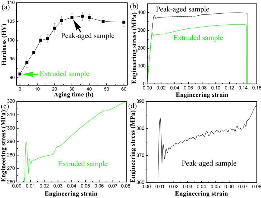 图3 (a)挤压态细晶Mg-14Gd-2Ag-0.5Zr合金在200 ºC的时效硬化曲线,(b)挤压合金和峰值时效合金的拉伸应力应变曲线,(c)挤压样品拉伸时发生屈服延伸率位置的放大曲线,(d)峰值时效样品拉伸时发生屈服延伸率位置的放大曲线