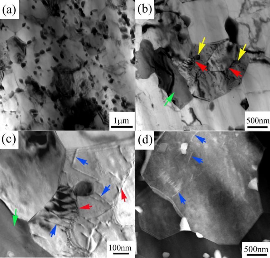 图4 挤压态细晶Mg-14Gd-2Ag-0.5Z合金的TEM微观组织与位错观察,(a)含有大量动态析出沉淀的细晶粒组织形貌,(b)再结晶晶粒内部化合物和位错重排结构的形貌,(c)位错界面和可动位错形貌,(d) HAADF-STEM 观察的位错位置元素偏聚现象,入射电子束平行[11-20]Mg