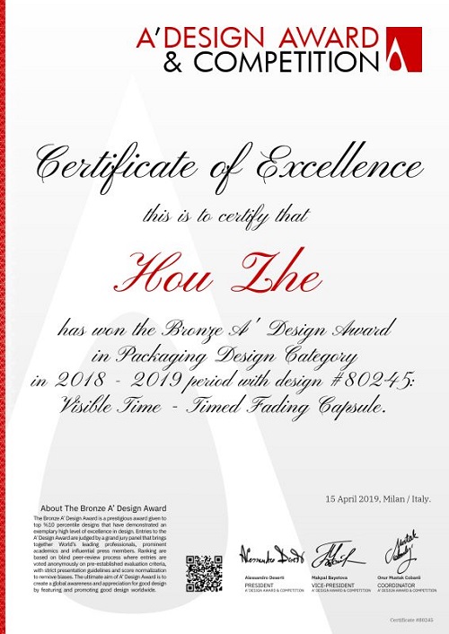 4月15日,意大利A'Design Award设计大赛赛果出炉,、“可见时间定时褪色胶囊”作品获得了大赛铜奖。