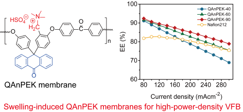 四是研制并验证了含蒽酮结构聚芳醚酮膜在钒液流电池中优秀性能(ACS Applied Materials & Interfaces, 2022, DOI: 10.1021/acsami.2c14107, 图4),揭示了大体积、平面结构的蒽酮结构对膜性能调控的关键作用,发现含蒽酮结构聚芳醚酮是一种很有前景的低成本高性能膜材料。