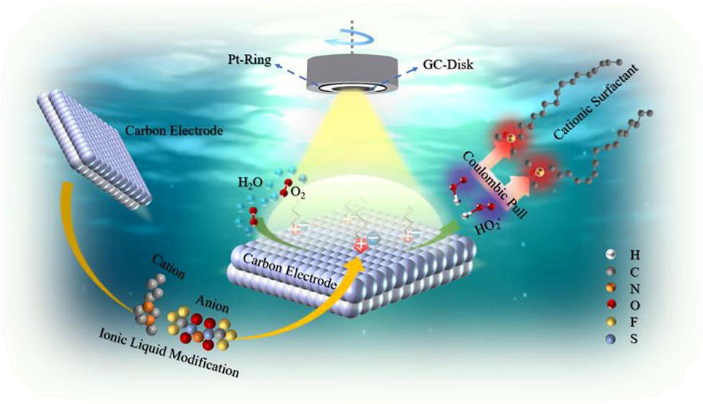 通过浸渍法将离子液体(IL)负载到乙炔黑(AB)载体上制备IL@AB催化剂,并与电解液中的表面活性剂分子协同作用调节电极-电解质界面结构提升催化剂性能。研究发现,IL@AB催化剂使电合成H2O2的选择性成倍增加,并且在电解液中加入阳离子表面活性剂,可以使固-液界面上的过氧化物阴离子更容易解吸,从而使H2O2的选择性进一步提高(高选择性可以长时间保持稳定)。(该工作发表在Chemical Engineering Journal, 2022, 444, 136665,图1)