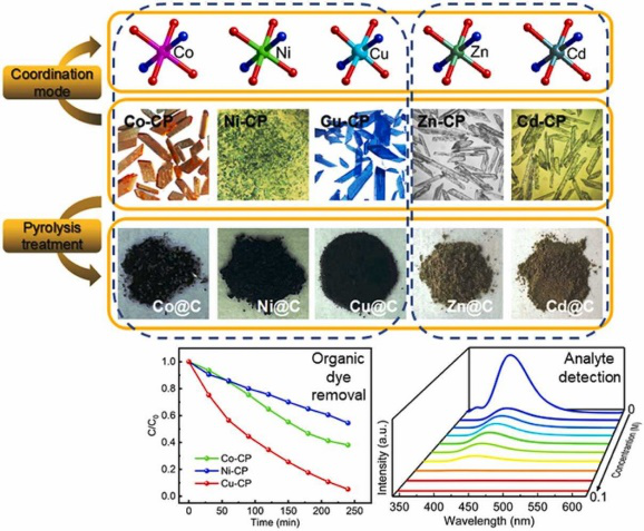 本研究采用热解法将配合物作为前驱体直接碳化,或者将杂原子从MOF的催化剂前驱体中加入到层状碳纳米结构中可以改善吸附性能。研究成果揭示了具有高比表面积和热稳定性的碳基纳米材料对有机染料选择性吸附,相关工作发表在( Dalton Trans, 2021, 50, 10549 (图4)、 Journal of Inorganic and Organometallic Polymers and Materials, 2022, 32, 700、 RSC Adv, 2021, 11, 33102和Journal of Solid State Chemistry, 2021, 304, 122589 )