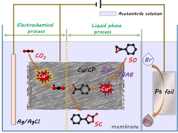 图2. Cu/CP电催化剂催化CO2和SO电化学环加成制备SC示意图