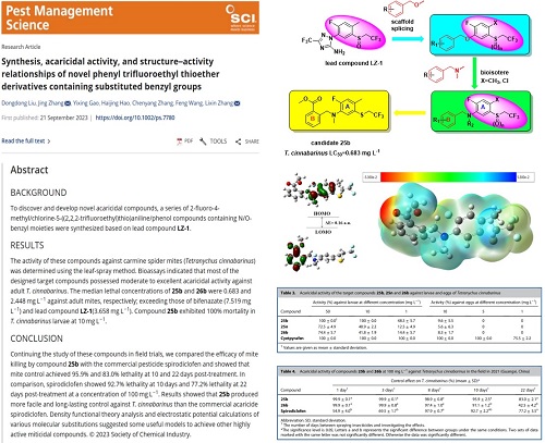 近日,农林科学领域国际权威期刊《Pest Management Science》(中国科学院1区Top, IF = 4.1)在线发表了沈阳化工大学功能分子研究所张立新教授团队的研究论文“Synthesis, acaricidal activity, and structure–activity relationships of novel phenyl trifluoroethyl thioether derivatives containing substituted benzyl groups”(https://doi.org/10.1002/ps.7780),贝博官网2020级联合培养博士研究生刘东东为第一作者,功能分子研究所张静高级工程师和张立新教授为共同通讯作者。