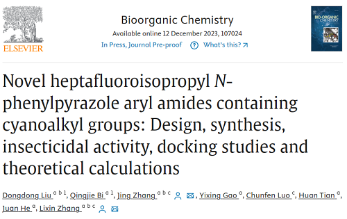 2023年12月,贝博官网功能分子研究所绿色新农药创制团队在药物化学领域国际权威期刊《Bioorganic Chemistry》(中国科学院1区Top,IF=5.1)发表了题为“Novel heptafluoroisopropyl N-phenylpyrazole aryl amides containing cyanoalkyl groups: Design, synthesis, insecticidal activity, docking studies and theoretical calculations”的科研成果(https://doi.org/10.1016/j.bioorg.2023.107024)。论文第一作者为沈阳化工大学2020级联合培养博士研究生刘东东和2021级硕士研究生毕庆杰,通讯作者为功能分子研究所张静高级工程师和张立新教授。该工作以BB贝博艾弗森官方网站为第一完成单位。