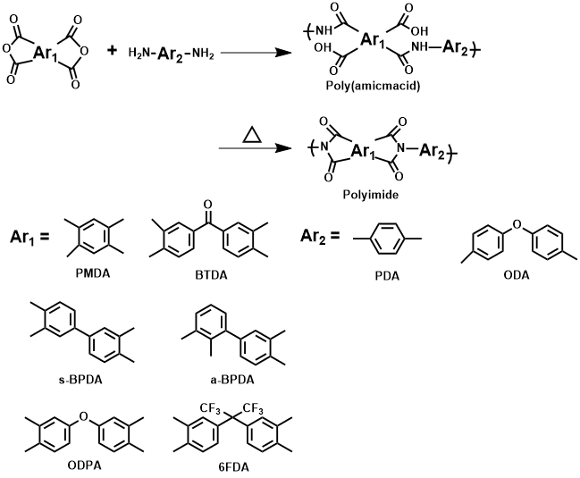 图1 聚酰亚胺(PI)的合成路线及结构。