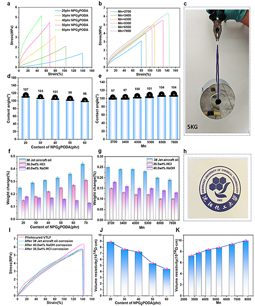 图3(a)NPG2PODA用量对光固化VTLF力学性能的影响。(b)Mn对光固化VTLF力学性能的影响。(c)厚度为0.5mm光固化VTLF薄膜可承重5 kg。(d)NPG2PODA用量对光固化VTLF水接触角的影响。(e)Mn对光固化VTLF水接触角的影响。(f)NPG2PODA用量对光固化VTLF化学稳定性的影响。(g)Mn对光固化VTLF化学稳定性的影响。(h)光固化VTLF薄膜的透光率。(i)光固化VTLF在不同溶剂浸泡后的力学性能。(j)NPG2PODA用量对光固化VTLF体积电阻率的影响。(k)Mn对光固化VTLF体积电阻率的影响。