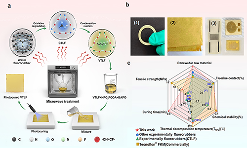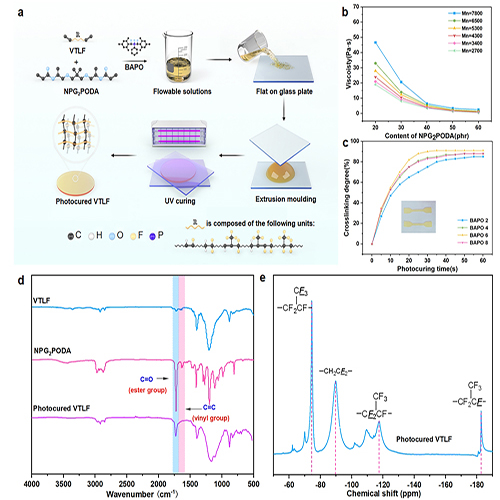 图1 (a)VTLF的精准合成及其光固化反应路线。(b) (1) 3D打印的VTLF密封圈。(2)光固化成型的VTLF芳纶纤维增强复合材料。(3)光固化成型的VTLF柔性传感器。(c)本项研究与其他含氟弹性体的性能对比。