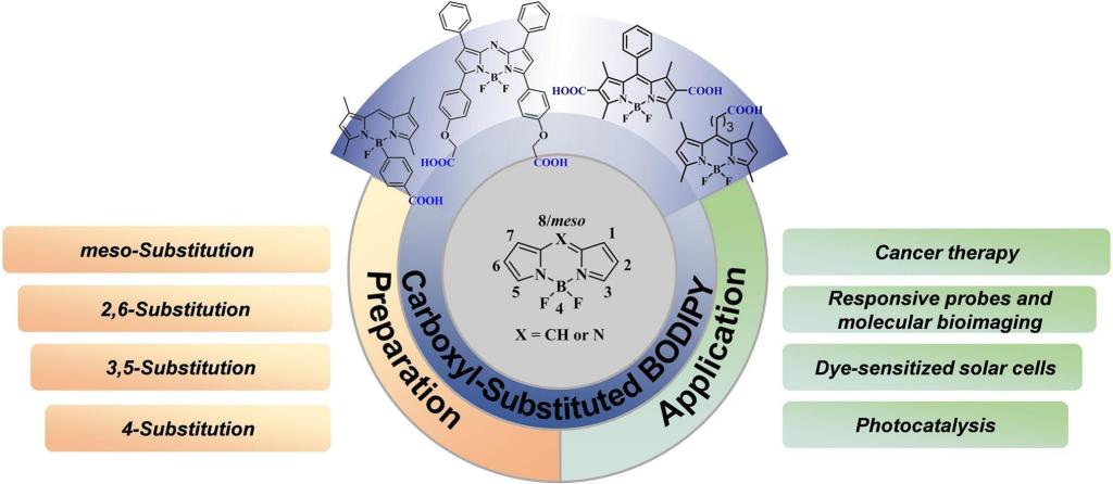 氟硼二吡咯甲川(BODIPY)染料因其高摩尔消光系数、优异的光稳定性和可调控吸收波长,在生物医学、能源转换和光催化等领域具有广阔应用前景。然而,传统BODIPY染料存在水溶性差、生物相容性不足等问题,限制了其实际应用。通过引入羧基官能团,可以提升染料的溶解性、稳定性和功能多样性,并拓展其在癌症治疗、生物成像、太阳能电池和光催化等领域的应用边界。该论文首次系统梳理了羧基在BODIPY分子不同位点(如meso位、2,6位、3,5位等)的定向引入策略,阐明了羧基通过改善染料亲水性、增强金属配位能力及提供生物偶联位点等机制,推动其在癌症治疗、生物检测等方面突破性应用。同时,指出未来需攻克的关键挑战,包括aza-BODIPY羧基化研究不足、近红外二区染料开发及规模化制备技术瓶颈等问题。