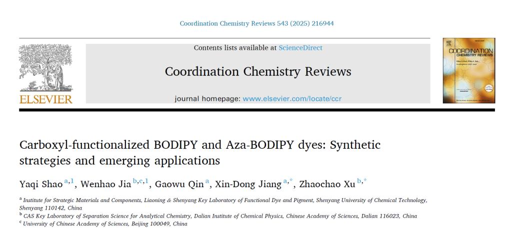 近日,贝博官网战略材料与构件研究院秦高梧、姜新东团队及合作者在国际著名期刊Coordination Chemistry Reviews以“Carboxyl-functionalized BODIPY and Aza-BODIPY dyes: Synthetic strategies and emerging applications”为题发表高水平综述文章。《Coordination Chemistry Reviews》创刊于1966年,是国际权威期刊,当前影响因子IF 23.5。
