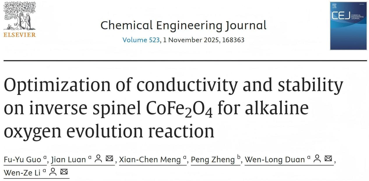 理学院李文泽教授研究团队在高效OER电催化剂设计与制备领域取得研究进展,相关研究成果以Optimization of conductivity and stability on inverse spinel CoFe2O4 for alkaline oxygen evolution reaction为题发表在国际期刊Chemical Engineering Journal上。第一作者为理学院硕士研究生郭富钰,通讯作者为理学院栾健讲师、段文龙讲师和李文泽教授。BB贝博艾弗森官方网站为论文的第一单位。