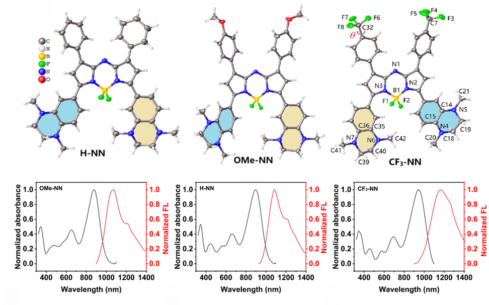 传统 NIR-II aza-BODIPY 多采用 julolidine 供电子单元,其吸收通常停留在 NIR-I 区域。本研究引入 1,4-二甲基-1,2,3,4-四氢喹喔啉(NN)并结合-CF₃ 吸电子基团,构建 D-A-A' 体系,实现显著红移:其拥有高摩尔消光系数主吸收峰,发射峰延展至1400 nm。其独特的NN系列分子结构得到晶体证实。