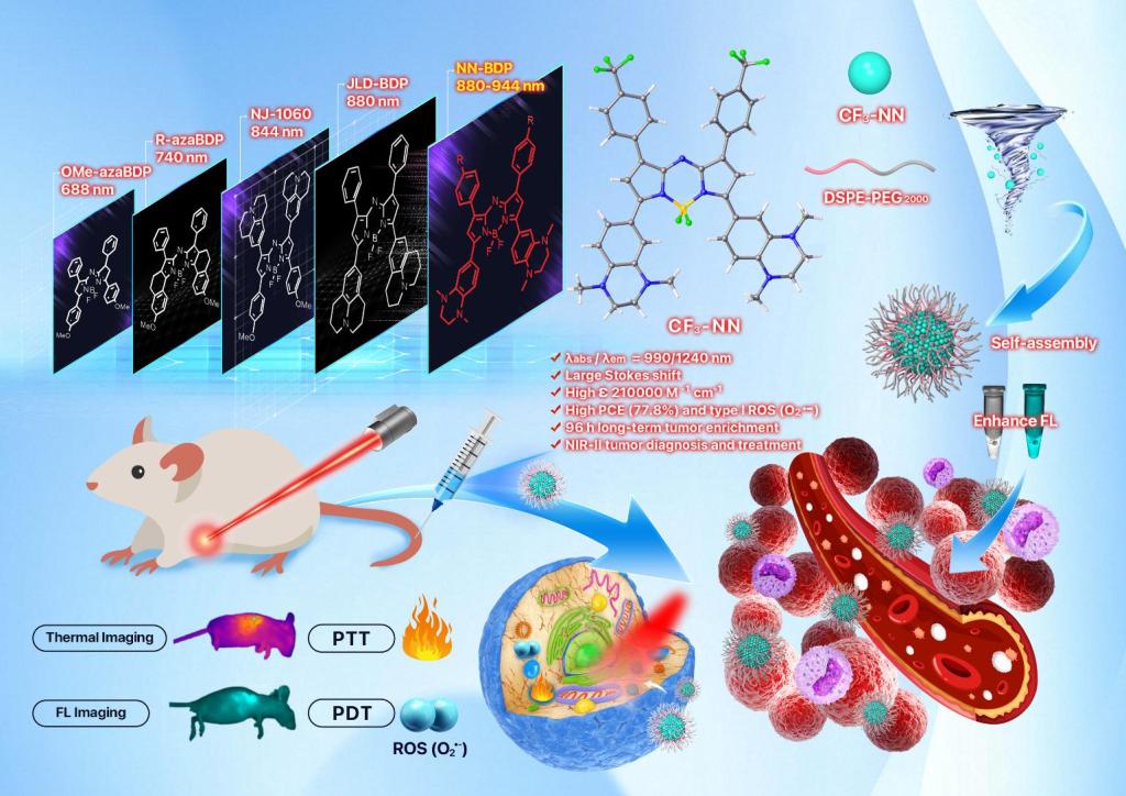 图1:近红外aza-BODIPY的构建思路、自组装CF3-NN NPs的制备和光诊疗机制的示意图
