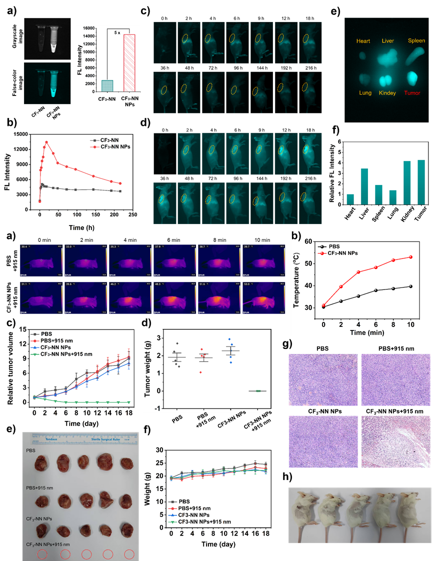 DSPE-PEG2000 包覆的 CF₃-NN 纳米颗粒具有优良水溶性与生物稳定性,在小鼠模型中通过 EPR 效应在肿瘤部位 18 小时富集达峰,光照 6 天后肿瘤完全消失且无复发,显示出低副作用的强效治疗能力。