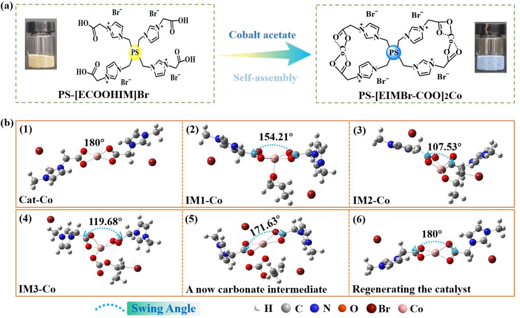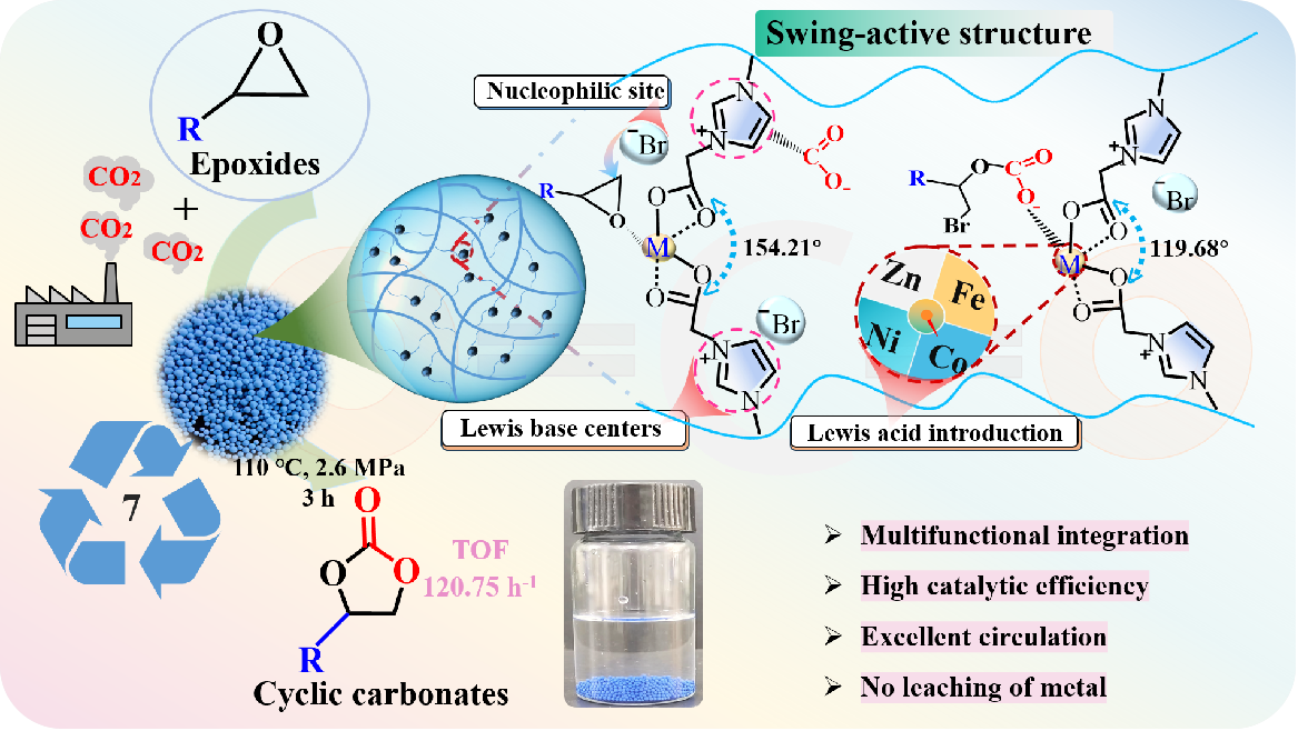 近日,BB贝博艾弗森官方网站特色资源化工与材料教育部重点实验室石磊教授团队设计并开发了系列具有丰富活性位点和动态可调活性结构的多功能集成非均相催化剂(PS-[EIMBr-COO]2M,M = Fe2+、Co2+、Ni2+和Zn2+),可用于高效催化CO2与环氧乙烷(EO)或环氧丙烷(PO)的环加成反应高效制备环状碳酸酯。最优PS-[EIMBr-COO]2Co催化剂在110 ℃下,PO的转化率达到98.92%,对PC的选择性达到99.00%,TOF高达120.75 h-1。多种表征手段和DFT理论模拟表明,PS-[EIMBr-COO]2Co催化剂的出色催化性能是催化剂中路易斯酸中心、咪唑基团(路易斯碱)、Br-离子(亲核位点)和摆动式活性结构共同作用的结果(见下图)。活性位点之间的协同作用降低了决定反应速率步骤的反应能垒,而催化剂中的可调摆动结构有助于提高活性位点与反应底物之间的接触效率(见下图)。合成的PS-[EIMBr-COO]2Co催化剂在经过多次循环后仍能保持高效催化能力。此外,PS-[EIMBr-COO]2Co催化剂对于环氧化物的环加成反应表现出良好的底物普适性。这种功能协同和动态活性结构的催化剂构建策略对多功能集成催化剂的合理设计和开发具有重要借鉴意义。