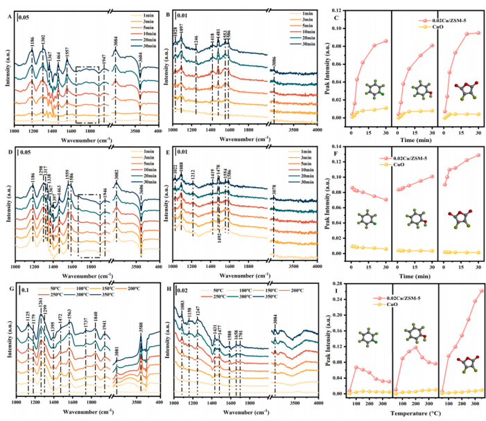 研究显示,0.02Cu/ZSM-5在240 ℃即可实现90%氯苯转化,并在连续40小时运行中表现出优异稳定性;相比之下,过量负载(0.04 mol/L)易生成CuO团聚体,覆盖活性位并抑制氧迁移,导致性能下降(下图A、E与G)。