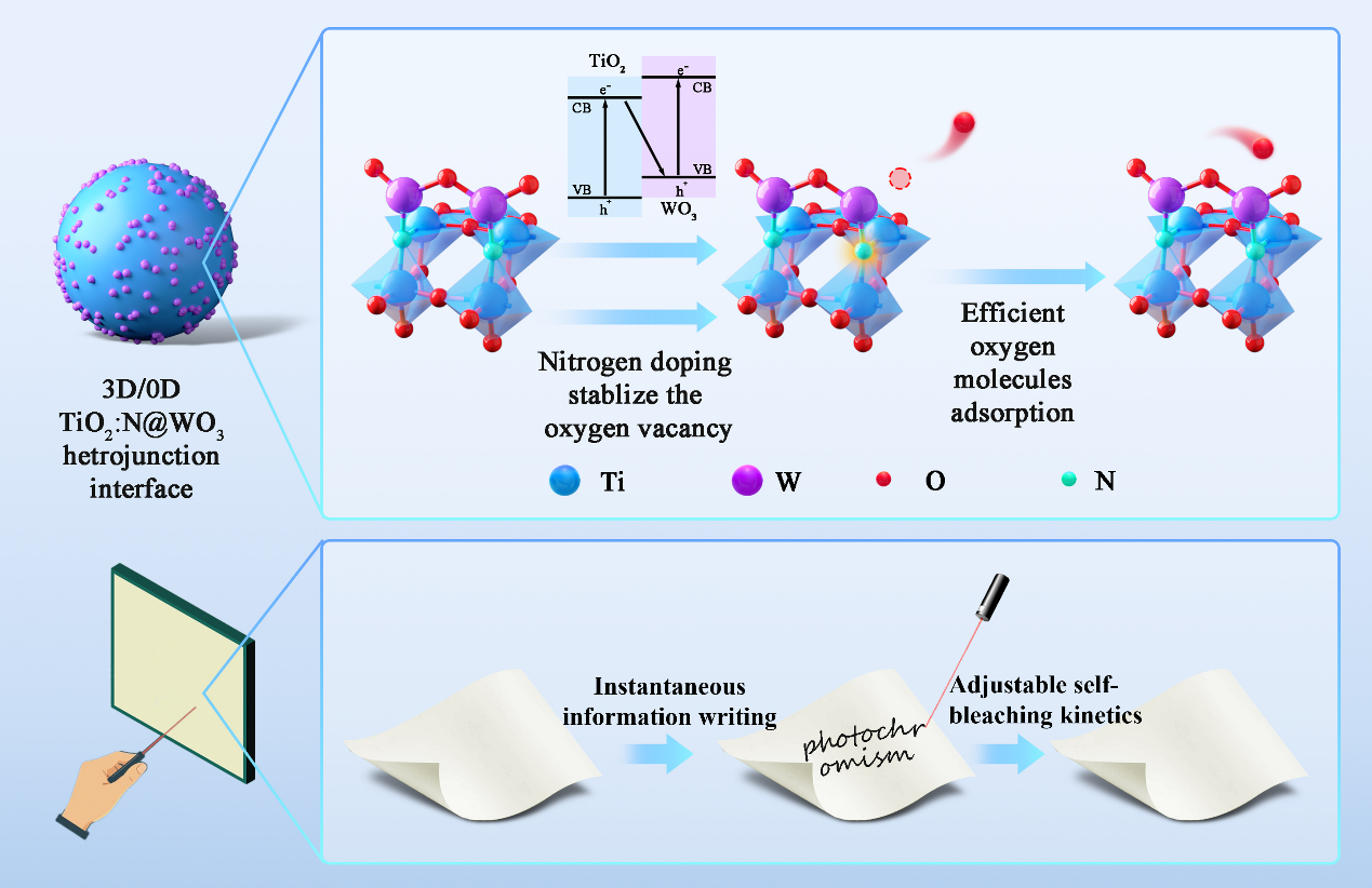 2025年11月17日,化学工程学院王康军教授团队在Chemical Engineering Journal发表题为“Z-Scheme 3D/0D TiO2:N@WO3 heterojunction interface drived sensitive photochromism and adjustable self-bleaching kinetics for advanced optical information storage media”的研究论文。BB贝博艾弗森官方网站王方可项目副教授为本研究第一作者,王康军教授、郑鹏副教授为通讯作者。BB贝博艾弗森官方网站为第一单位。WO₃基光致变色材料具备优异的化学稳定性、价格低廉等优势,在智能窗、防伪验证、光信息存储等领域应用前景广阔。然而,较慢的着色速度、漂白过程难以控制等缺陷限制其实际应用,着色速度低源于W5+较低的光还原活性;自漂白过程可控性差是由于W5+与氧气的反应活性较弱。因此,如何有效提升WO₃的着色与自漂白动力学性能,成为当前亟需解决的关键问题。