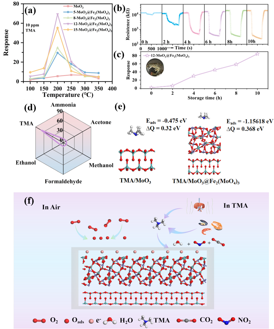针对食品安全领域腐败标志物三甲胺(TMA)检测中存在的灵敏度低、响应速度慢等技术瓶颈,贝博官网化学工程学院伞晓广教授、孟丹教授团队成功设计并构建了MoO3@Fe3(MoO4)3核壳异质结构材料,系统探究了该材料对痕量TMA的气敏性能及作用机制。研究表明,这种核壳异质结构可有效调控MoO3的电子结构,显著增强敏感材料表面Lewis酸性;同时,异质界面显著提升氧空位浓度,为气体吸附与表面反应提供了丰富充足的活性位点。此外,界面电荷转移效率的提升与材料的带隙剪裁,进一步强化了材料对TMA分子的吸附能力。