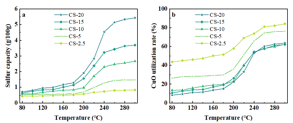 图. 温度对Cu基吸附剂的硫容和CuO利用率的影响