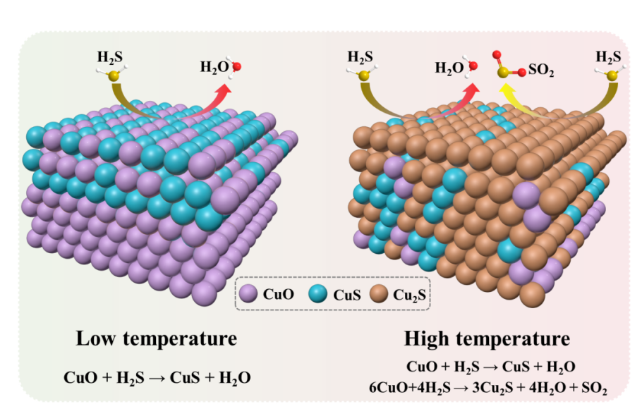 2026年1月15日,BB贝博艾弗森官方网站特色资源化工与材料教育部重点实验室许光文教授团队为了阐明影响CuO吸附剂性能的关键因素,制备了不同CuO含量(2.5-20 wt%)的CuO/SiO2吸附剂,并评估了其在80-300°C下的H2S去除效率。所有吸附剂的H2S去除性能都明显依赖于温度:在80-180°C的低温区域,突破硫容量和CuO利用率都略有增加,在180-260°C的中温区域增加较大,在260-300°C的高温区域保持较高但几乎不变。此外,还发现在低温下,H2S的去除主要发生在CuO纳米颗粒的表层和亚表层;在中温下,在动力学控制下,主要形成CuO核/CuS壳层纳米结构;在高温下,主要是CuS分解为S,然后元素S扩散到CuO纳米颗粒的内层,并与CuO反应形成Cu2S,同时释放SO2。