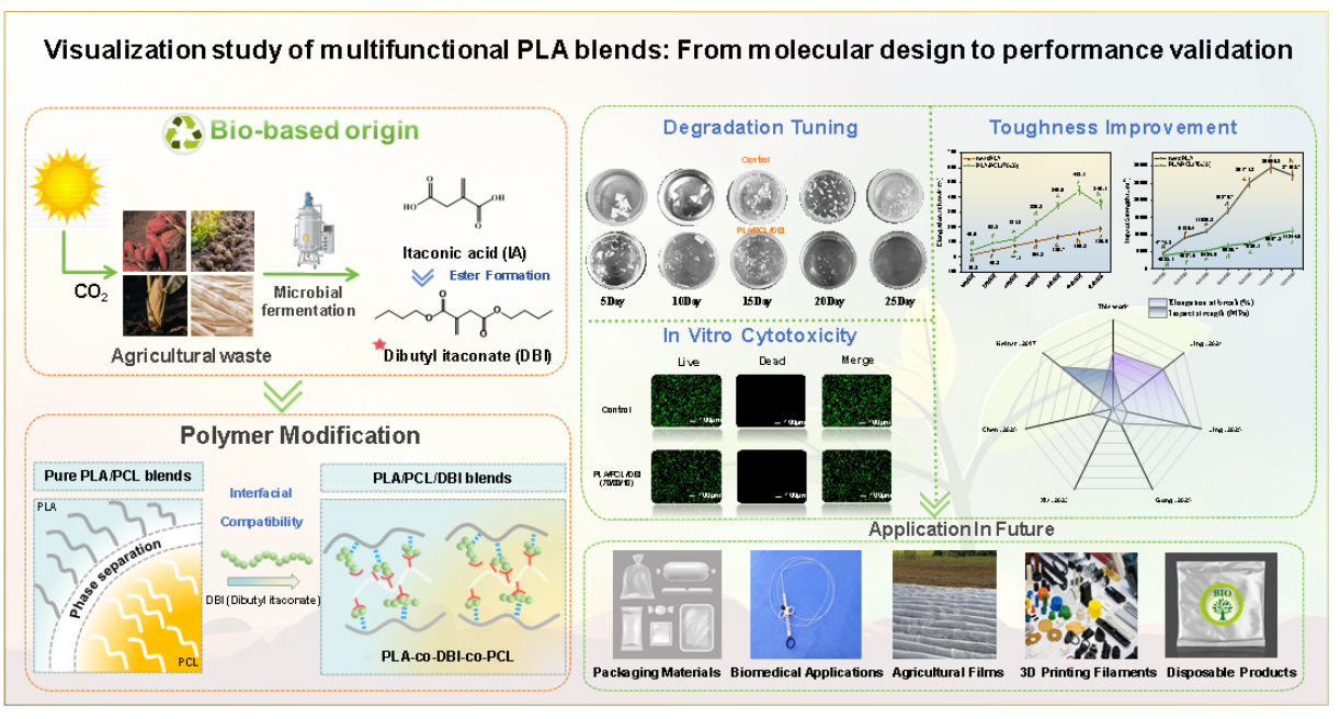 随着塑料污染问题日益严峻,可降解聚合物被认为是实现低碳与可持续材料体系的重要方向。其中,聚乳酸(PLA)因其来源可再生、生物相容性好而受到广泛关注,但其固有的脆性和韧性不足严重限制了实际应用。将聚己内酯(PCL)引入PLA体系是一种有效的增韧策略,然而由于PLA与PCL在热力学上不相容,二者易形成明显的相分离结构,界面结合力弱,导致力学性能和稳定性难以兼顾。现有相容剂虽可在一定程度上改善界面相互作用,但多数依赖石油基原料或仅发挥单一物理增塑作用,难以同时实现高效相容化、性能提升与可控降解。因此,开发一种兼具反应活性、生物基来源及多重功能的相容策略,仍是PLA/PCL复合体系面临的关键科学与工程挑战。
