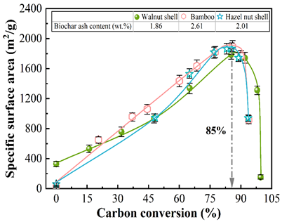图.不同低灰原料的生物炭活化过程中比表面积的演变特性