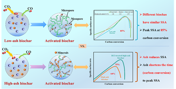 生物炭凭借比表面积大、孔隙结构丰富、含氧官能团充足等优异特性,已被广泛应用于吸附材料、催化材料、储能材料等炭基功能材料领域。其中,比表面积是决定生物炭应用性能的关键因素,而生物炭活化则是提升其孔隙度最为有效的手段之一。当前,生物炭活化技术仍面临诸多难题:不同原料制备的生物炭,其比表面积大小及演化规律存在显著差异,而造成这一差异的主导机制尚不明确;同时,生物炭活化的最优工艺条件及其动态演变规律仍不清晰。这导致工业化场景下原料适配性评估困难,且难以实现活化终点的精准判别与过程可控。