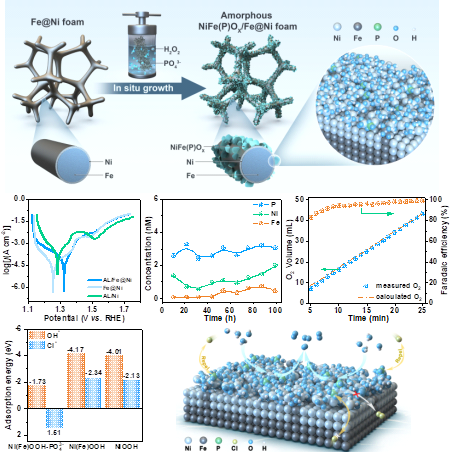 氢气因其高能量密度与零碳排放特性,被视为理想的清洁能源载体。利用可再生电力驱动水电解制氢是可持续生产绿氢的核心路径。将储量丰富的海水资源与可再生能源耦合,发展直接海水电解制氢技术,对推动能源结构转型具有重要战略意义。然而,该技术面临多重挑战:阳极析氧反应(OER)动力学缓慢,能量效率受限;海水中高浓度Cl⁻引发析氯副反应(CER),降低选择性并腐蚀电极;高电流密度下气泡累积阻碍传质,导致催化剂失活。开发兼具高活性、高稳定性、抗腐蚀性与良好传质性能的阳极材料是实现工业化应用的关键。本研究采用原位水热法,直接在Fe@Ni泡沫集流体表面构筑非晶FeNi磷酸盐纳米片阵列。电解过程中,预催化剂原位重构为高活性Ni(Fe)OOH,结合电极超亲水-超疏气特性强化传质,显著提升海水氧化性能。该电极的多重协同稳定性机制包括:(1)PO43- 动态吸附形成静电屏障,排斥Cl⁻抑制CER;(2)Fe3+溶解-再沉积实现表面自修复;(3)Ni包覆层保护Fe骨架免受腐蚀;(4)高OER选择性从根本上抑制副反应。上述协同作用赋予电极优异的电解海水性能,为规模化绿氢制备提供了新的材料设计思路。