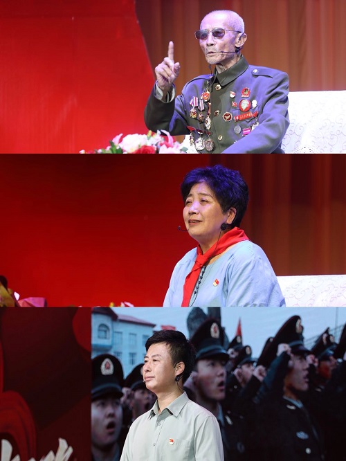 校大学生国旗护卫队代表为蒋庆泉献“致敬英雄”绶带;校“化工报国”大学生理论宣讲团代表接受刘静签名旗帜;校学雷锋志愿服务总队代表赠送吴锡有班长志愿服务红马甲,聘为志愿服务导师。我校教师代表演唱了《英雄赞歌》《再唱山歌给党听》《江山》等红色歌曲,并向三位英雄人物和先进模范敬献鲜花,表达对他们的深深敬意。