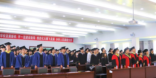 典礼在嘹亮的国歌声中拉开帷幕。方庆红教授代表硕士研究生导师发言,表达了对毕业生的美好祝愿。教师代表于洋为毕业生送上要“坚持读书学习,在读书中练就宽广的胸怀和坚守自己的梦想”的谆谆叮嘱。毕业生代表王鑫宇同学向母校献上来自全体2021届毕业生的深情告白,感恩母校的培养与师长的教导。