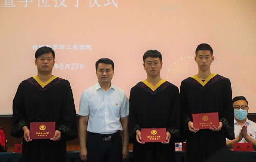 团委书记战申宣读材料科学与工程学院2021年获得辽宁省普通高等学校优秀毕业生和BB贝博艾弗森官方网站优秀毕业生名单;研究生院院长宗学军宣读材料科学与工程学院2021届硕士研究生获得学位名单;学科发展规划处处长孙亚光宣读材料科学与工程学院2021届本科生毕业和获得学位名单。材料科学与工程学院学位评定委员会成员共同为授位的本硕毕业生拨苏正冠。