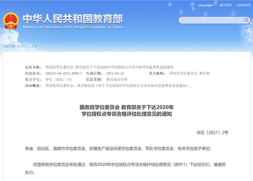 日前,国务院学位委员会、教育部发布《关于下达2020年学位授权点专项合格评估处理意见的通知》(学位〔2021〕2号),公布了2020年学位授权点专项合格评估处理意见以及学位授予单位主动提出放弃授权的学位授权点名单。全国共有345个学位授权点参评,处理意见为“继续授权”的学位授权点334个,处理意见为“限期整改” 的学位授权点5个,处理意见为“撤销授权”的学位授权点6个。贝博官网参评的外国语言文学一级学科和会计硕士专业学位类别顺利通过评估,学位点将继续授权。