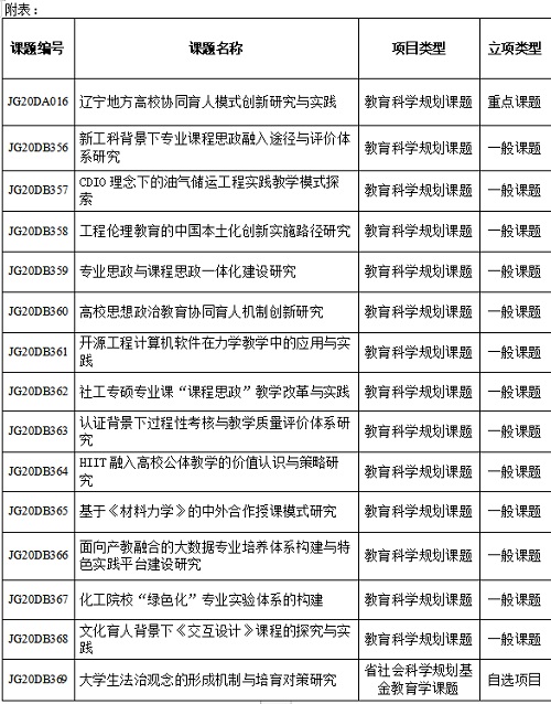 日前,辽宁省教育科学规划领导小组办公室通知公布省教育科学规划立项课题评选结果(辽教科规办字[2021]4号),贝博官网15个项目获得省教育科学规划课题立项,其中重点课题1项、一般课题13项、教育学自选课题1项(名单见附表)。贝博官网此次规划课题立项项目的数量位居我省高校前列,保持了学校近年来教改研究的良好态势,也展现了教育教学改革工作的新思路和新成果。