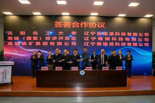 在许光文校长详细介绍签约项目后,BB贝博艾弗森官方网站、海城(腾鳌)经济开发区、海城镁矿集团有限公司、辽宁金隆溪科技有限公司、辽宁隆镁科技有限公司、辽宁麦格尼科技有限公司联合签署了《BB贝博艾弗森官方网站—鞍山海城市产学研融合 驱动菱镁产业聚集区高质量发展投资协议》。此次签署10.6亿投资协议,包括“辽宁省资源化工与材料产业技术创新研究院”、“BB贝博艾弗森官方网站菱镁产业学院”和国家重点研发计划项目“菱镁固废化工材料高值利用技术与基地集成示范”工程三个项目。“辽宁省资源化工与材料产业技术创新研究院”,由海城(腾鳌)经济开发区与BB贝博艾弗森官方网站共同建设,初期总投资1亿元;“BB贝博艾弗森官方网站菱镁产业学院”,由海城(腾鳌)经济开发区与BB贝博艾弗森官方网站共建,总投资1亿元;“国家重点研发计划项目产业化工程”,依托由BB贝博艾弗森官方网站牵头的国家重点研发计划项目“菱镁固废化工材料高值利用技术与基地集成示范”形成的技术,将在海城菱镁产业聚集区投资8.6亿,建设“2400万平米菱镁矿基阻燃型建筑板材生产示范工程”、“40万吨/年菱镁矿输送床闪速轻烧及3万立方清洁煤制气示范工程”、2套“20万吨/年菱镁矿悬浮煅烧”应用工程和“5000吨/年阻燃剂型氢氧化镁产业化工程”等五个工程。