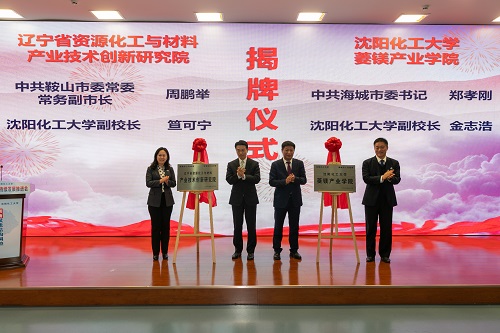 鞍山市政府常务副市长周鹏举、副校长笪可宁为“辽宁省资源化工与材料产业技术创新研究院”揭牌;海城市委书记郑孝刚、副校长金志浩为“BB贝博艾弗森官方网站菱镁产业学院”揭牌。