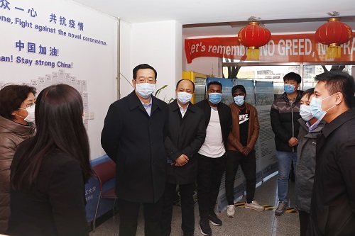 王明玉一行走访了学校北门值守、留学生公寓等场所。在留学生公寓,王明玉详细询问了在校留学生人数、日常饮食供应、生活保障和疫情防控工作宣传等情况。